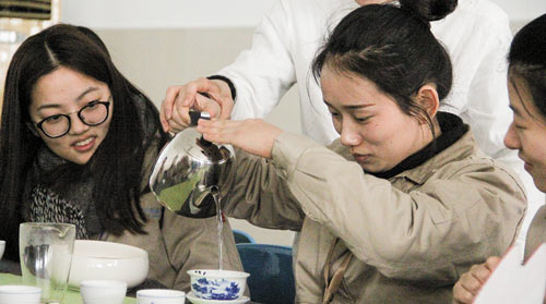 温杯、洗茶、泡茶、奉茶,这是茶的基本泡制步骤。加入茶艺运动的女员工们目不转睛盯着茶艺师的演出,生怕错过任何一个要害细节。到了体验环节,各人便现学现泡,在茶艺师的指导下有模有样地泡制起来,并相互奉茶,品茶。