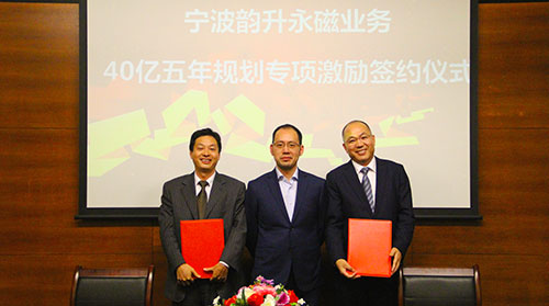 在今年年初的团体年度事情聚会会议上,团体董事局提出了五年销售收入破百亿的战略目标。永磁作为公司第一大支柱工业,自然是首当其冲,重任在肩。8月12日,公司永磁业务40亿五年计划专项激励签约仪式在二园陈诉厅举行。7家事业部率先与公司完成签约,作为主力军向五年40亿的目标提倡攻击。